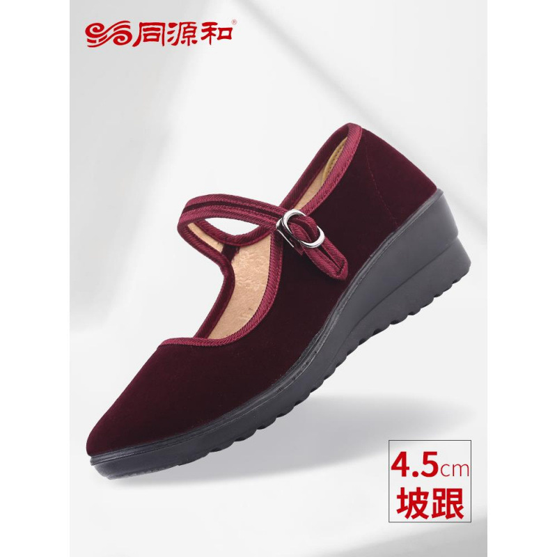 手作り靴、古い北京布靴、女性用バーガンディベルベット通気性ウェッジヒール、ワークモデル、赤いエチケットシューズ、ダンスシューズ