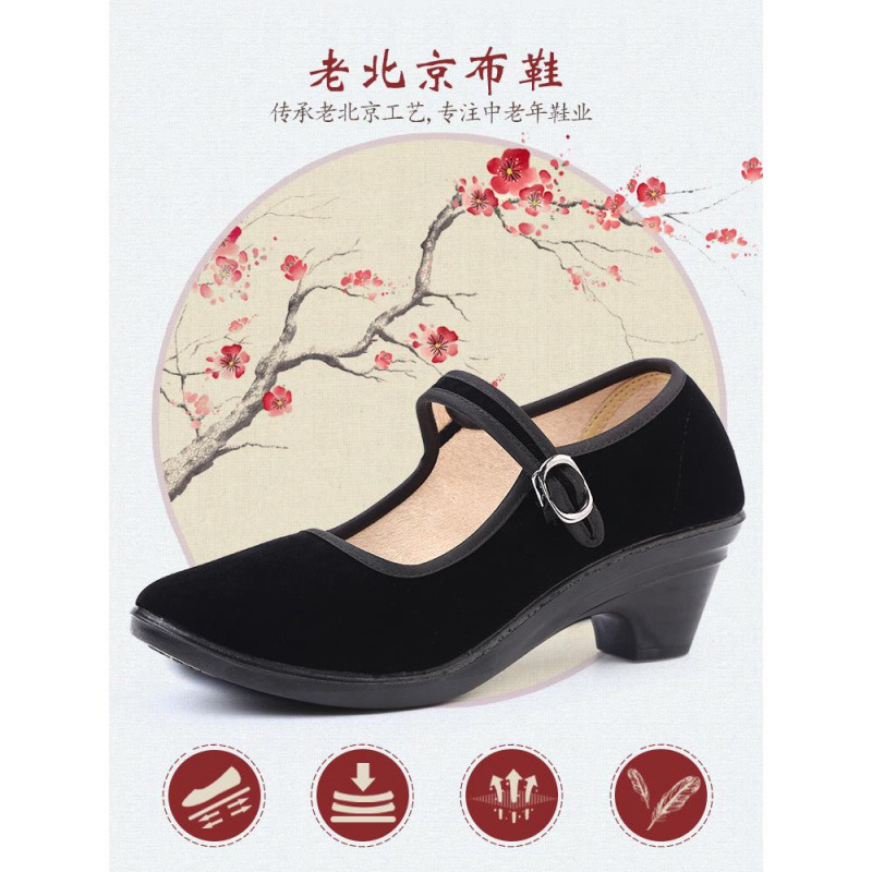 手作り靴、古い北京布靴、女性用黒ハイヒール、滑り止めホテルエチケット作業靴、オフィスミッドヒールダンスシューズ