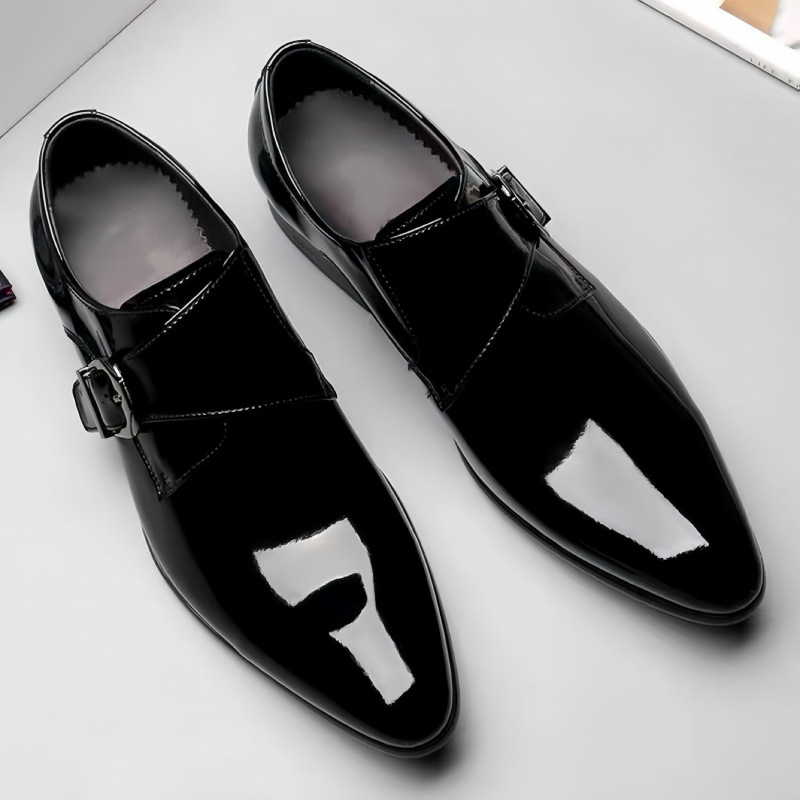 男性用の尖った革靴、韓国風の純黒のスーツ、トレンディなパテントレザー、多用途で通気性のある英国の光沢のあるフォーマルな男性用革靴