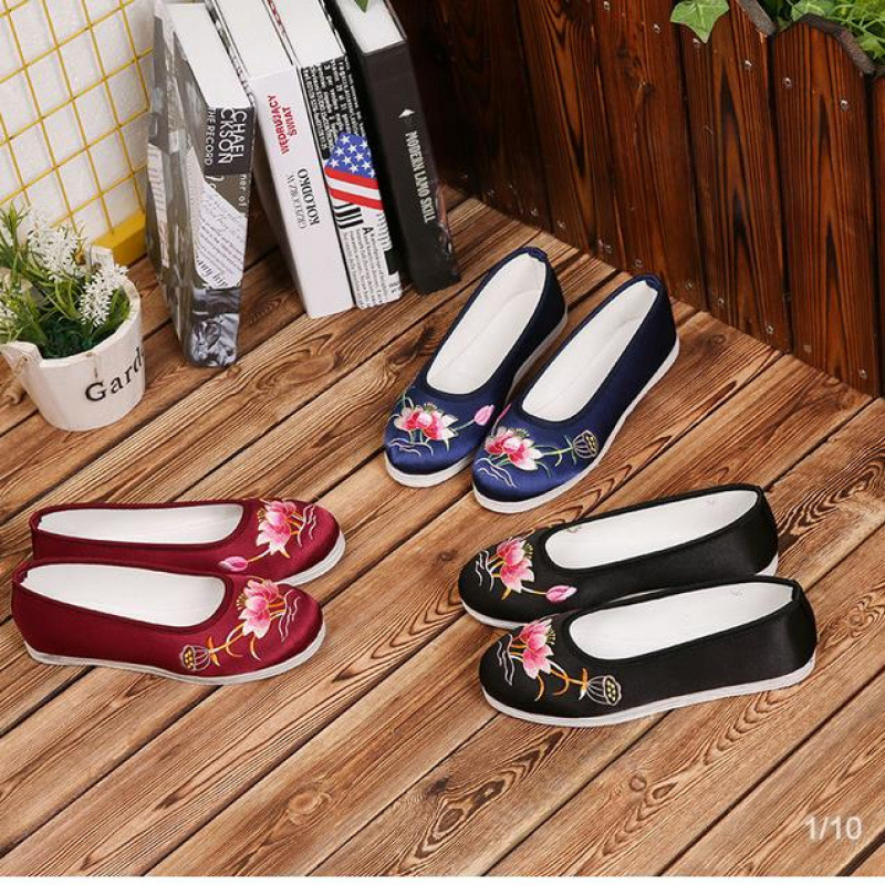 千層底布靴、婦人靴、古い北京布底靴、エスニックスタイルの誕生日靴、蓮の花の女性の漢服、古代衣装のチャイナドレス