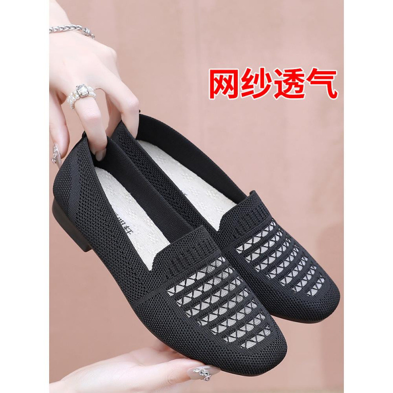 女性用メッシュシューズ、通気性のあるメッシュ夏の古い北京布靴、ニットメッシュスリッポンフラットソール、高齢者や母親向けの快適な靴