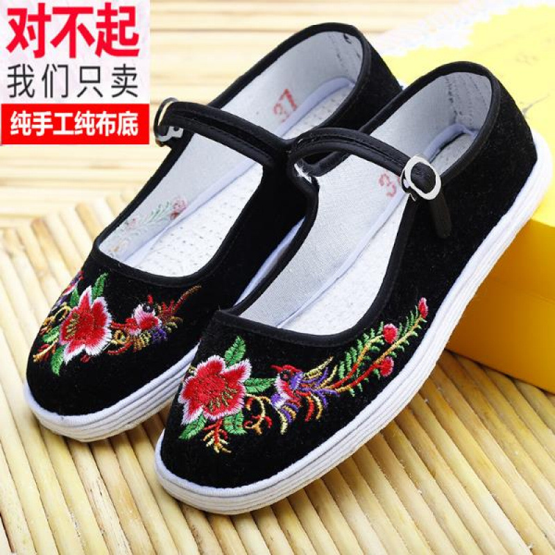 女性用千層底布靴、手刺繍、古い北京、古い柔らかい底、手作りのバックルストラップ、ロートップ、春と秋