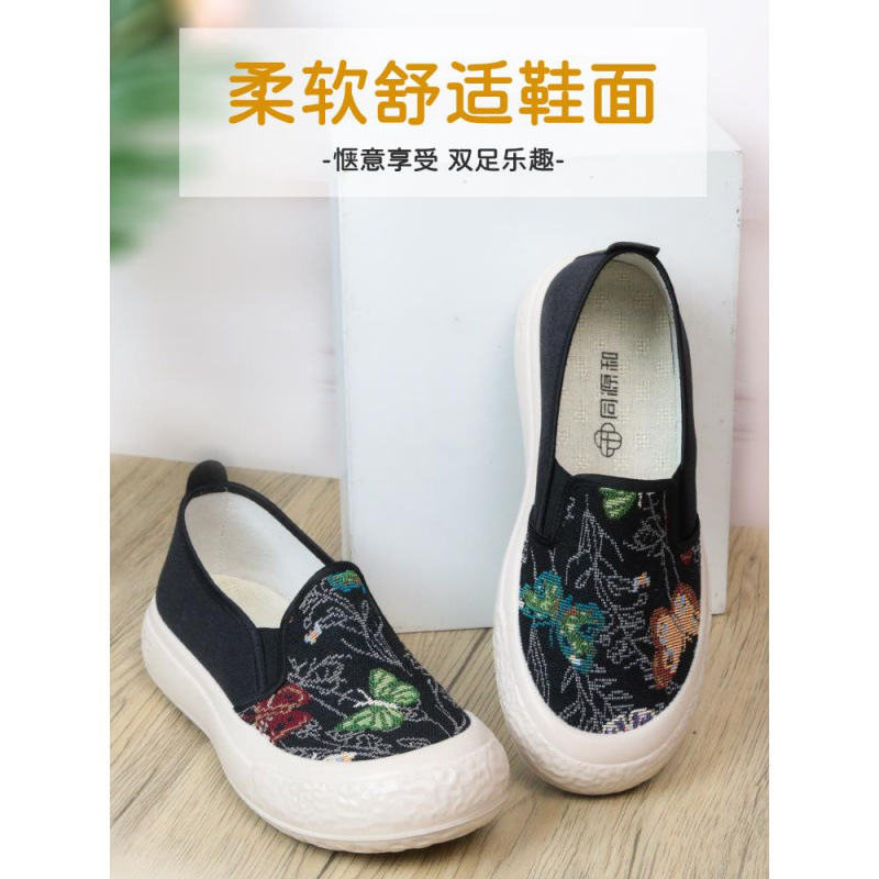 女性用手作りの古い北京布靴、新しい柔らかい底の刺繍入りスリッポン、中高年向けの快適で疲れにくい母親の閏月靴