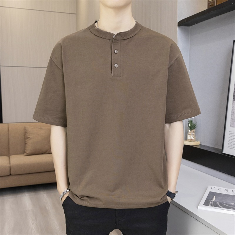 厚手の半袖Tシャツメンズ夏ゆったり薄手通気性ヘンリーカラーイントレンディブランド万能ボトムス半袖