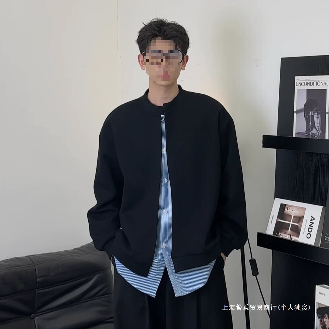 春と秋の韓国ストライプフェイクツーピースカーディガンスウェットシャツメンズカジュアルバックスリットデザイン韓国風イン長袖アウター
