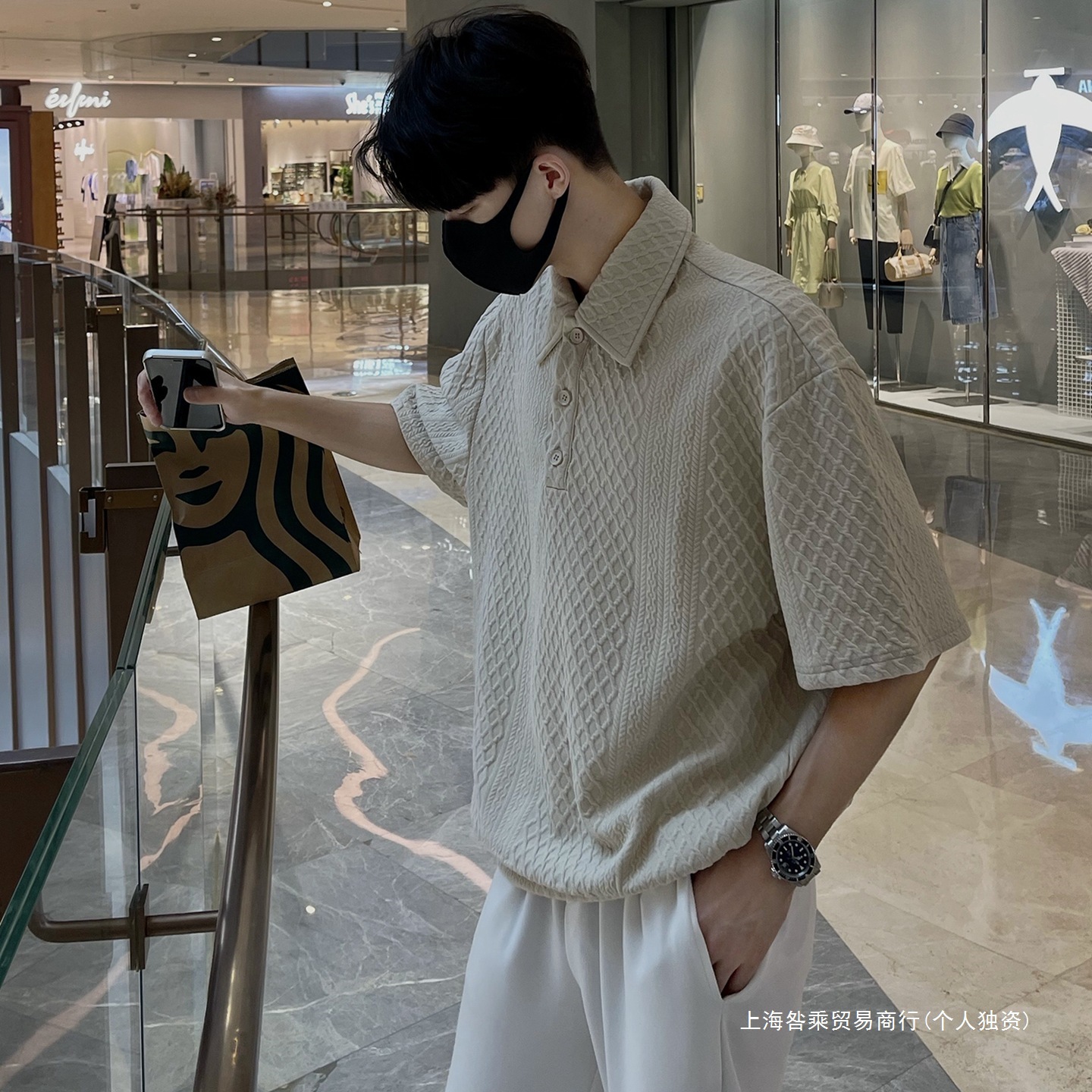 セクシーポロシャツメンズ半袖Tシャツ夏ゆったり韓国風トレンドワッフルラペル半袖プルオーバー
