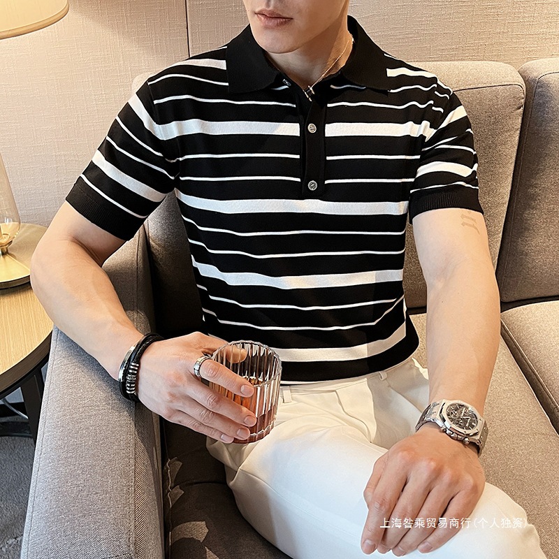 高品質メンズビジネスライト大人スタイル黒と白のストライプニットラペルポロシャツ気質カジュアル紳士服JO