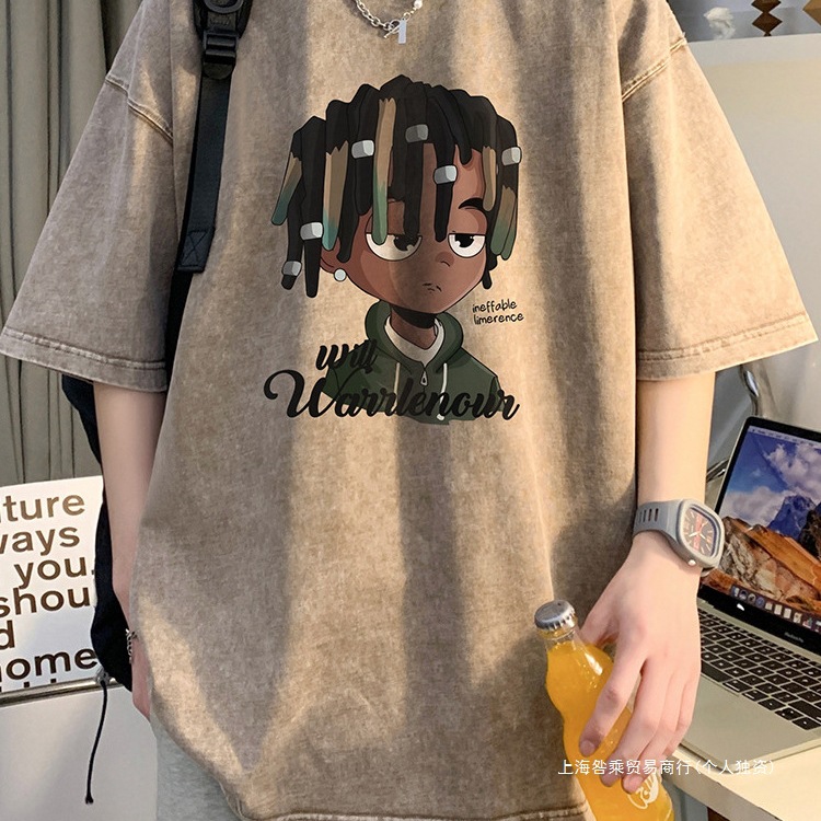 半袖Tシャツメンズ2024年夏新作トレンドルーズアメリカンヘビーウェイトピュアコットンウォッシュ加工オールドボーイズ