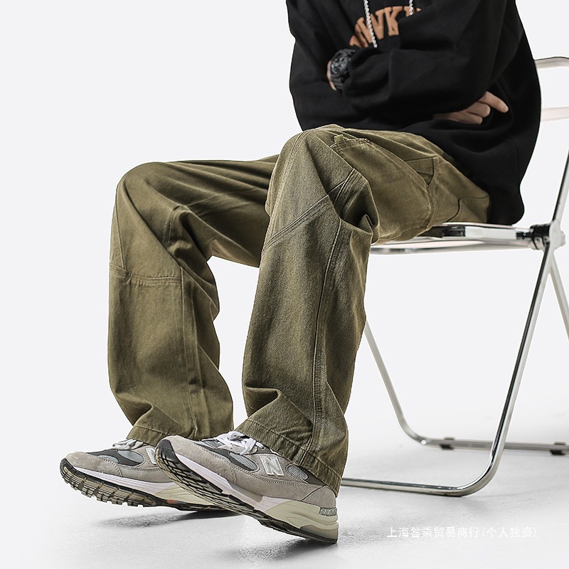 カーキの新しいスタイルの男性用カーゴパンツ、春と秋のトレンディなアウトドアハイストリート機能的なストレートカジュアルパンツトレンド