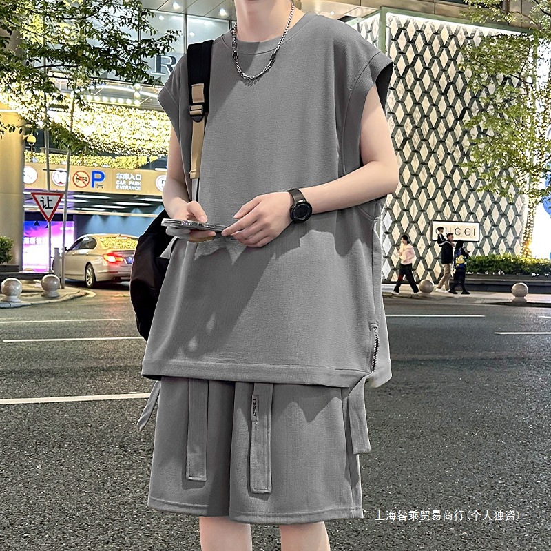 国境を越えたレジャースポーツスーツの男性夏の氷糸カン肩ベストの男性は、袖のないtシャツのセットを着ています