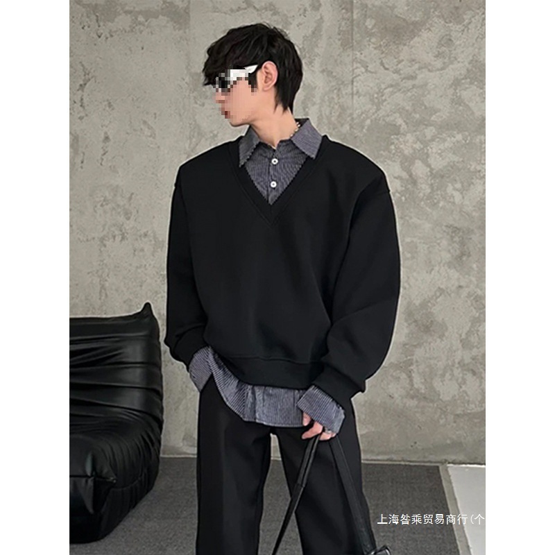 クロスボーダーの偽の2つのpolo襟の男性の春のcleanfitのシャツはデザイン感の長袖のiu系をつなぎ合わせます。