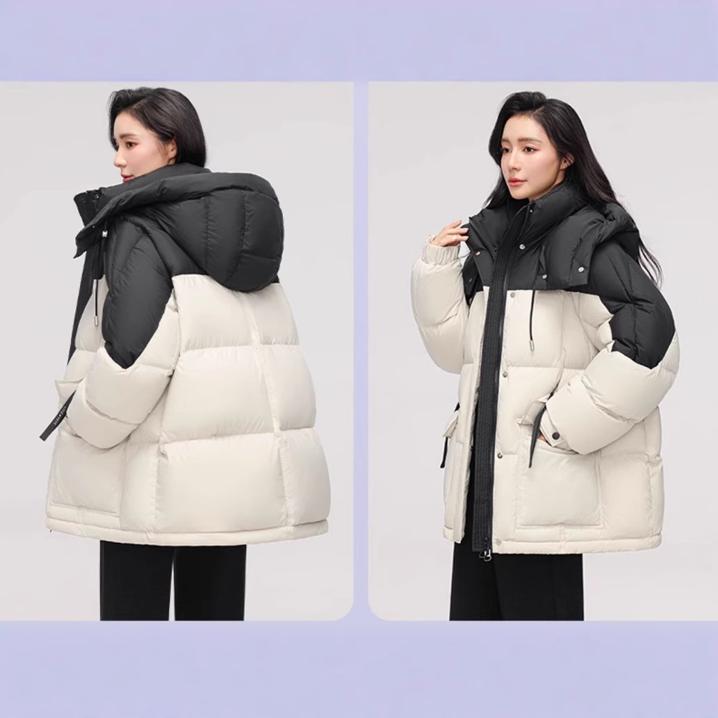 2025冬の新作ダウンジャケットショートファッション韓国風厚みのあるニッチカラーブロックフード付きジャケットコットンジャケットトレンディ