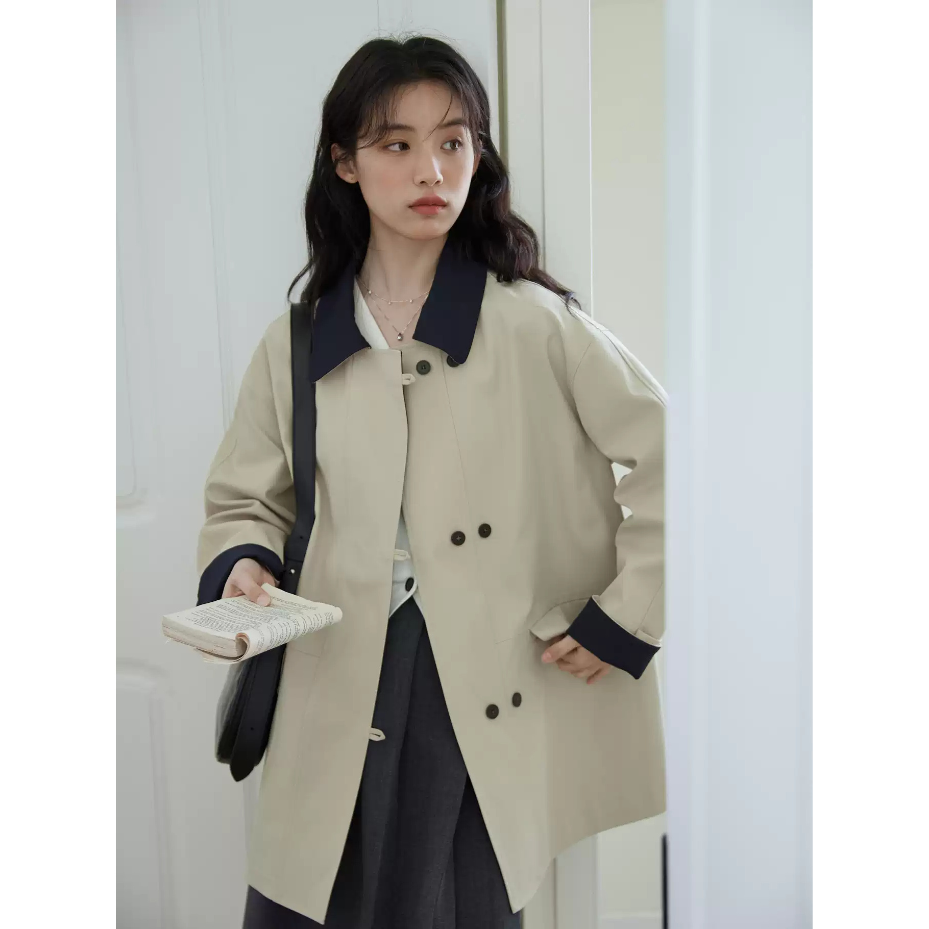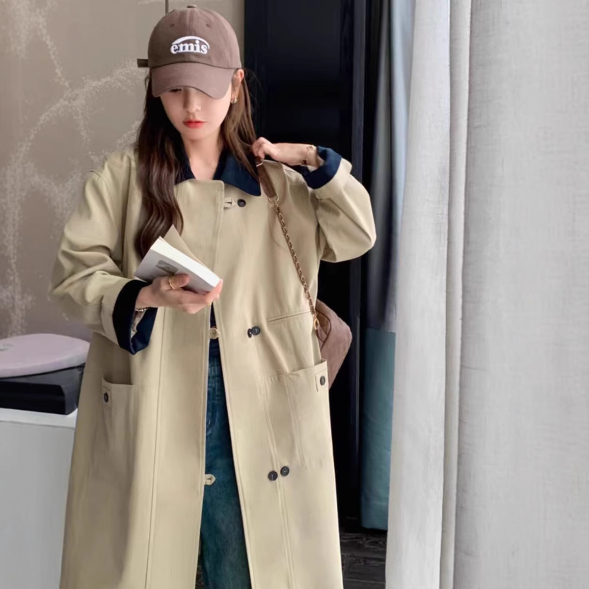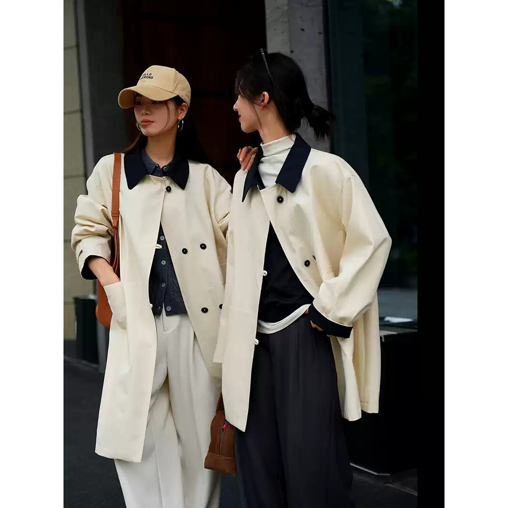 イギリス風配色切り替えトレンチコート レディース 2025春秋新作 カーキ 高級感 ゆったり 小柄さん向けコート
