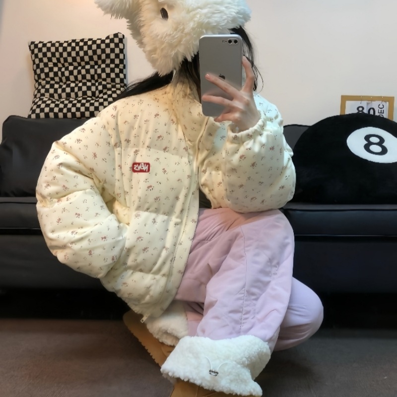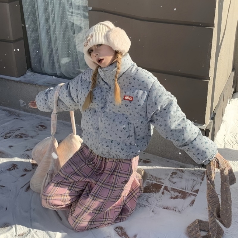 2024年の新型の小さい花の立襟の短いタイプの綿服の女性の冬のアメリカ式の厚い保温の綿服のパンの服のコート