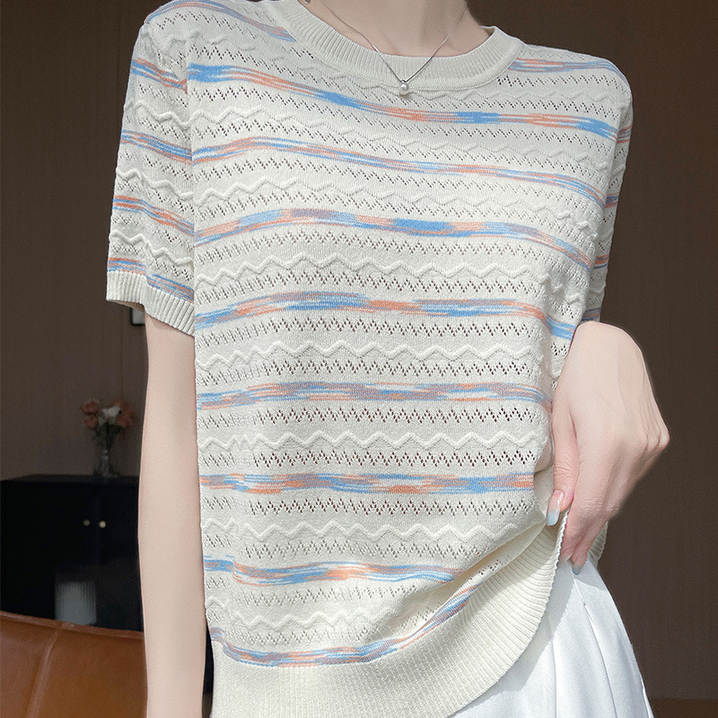 夏の女性のストライプアイスシルクニット半袖 Tシャツ女性のための 2025 新しいファッション多用途薄型 Tシャツトップス女性のための
