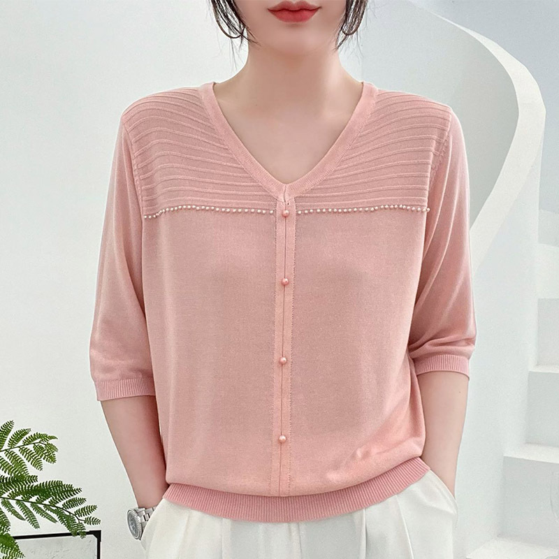 2025 新しい夏のテンセルリヨセル V ネックセーター半袖 Tシャツ女性の無地ビーズルーズボトムシャツ