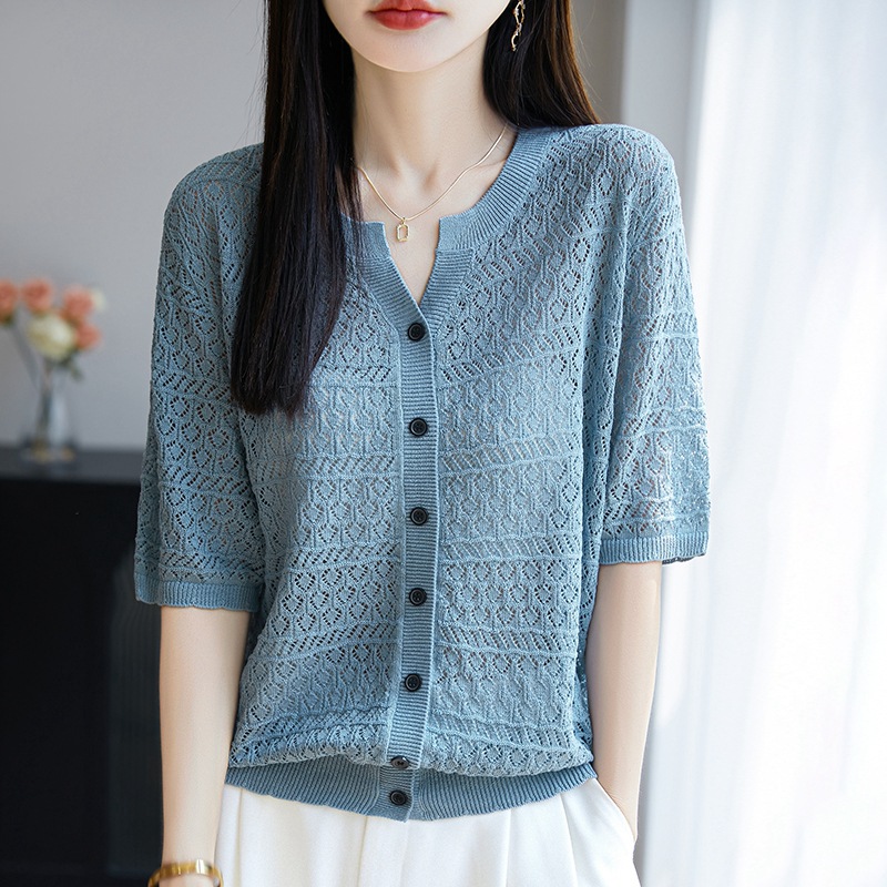 25夏新作 テンセルリヨセルVネックニットカーディガン 五分袖中空かぎ針編みルーズ万能トップス