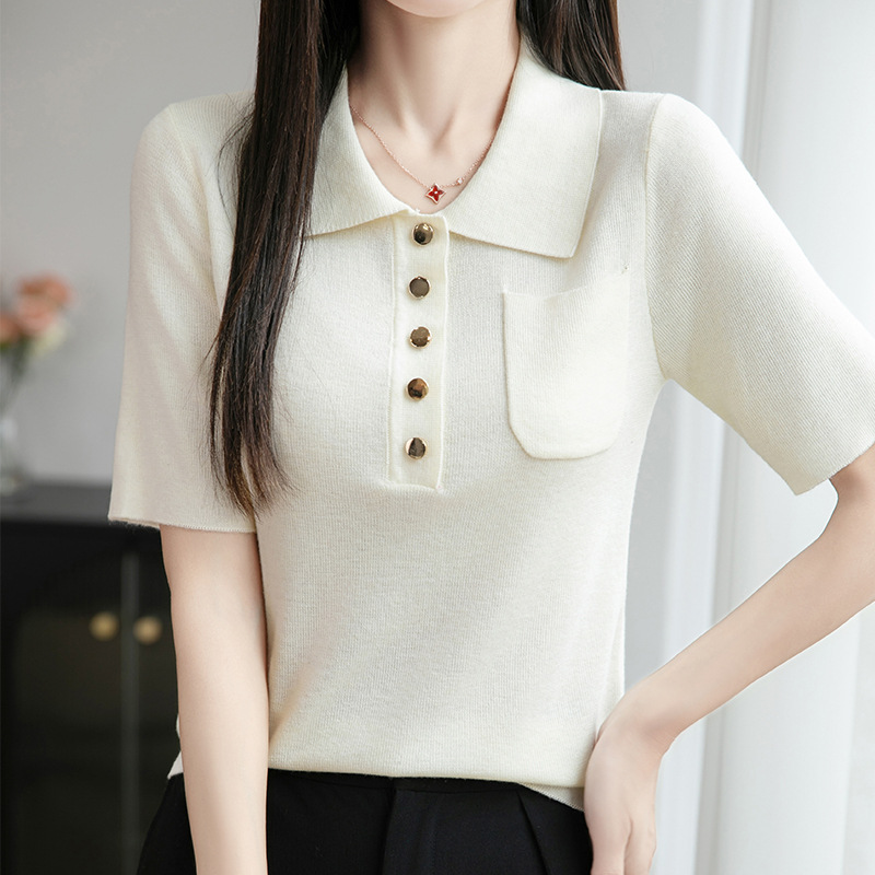 25 夏の新アイスシルクポロカラーセーター半袖 Tシャツ女性の無地プルオーバーボトリングシャツトップ