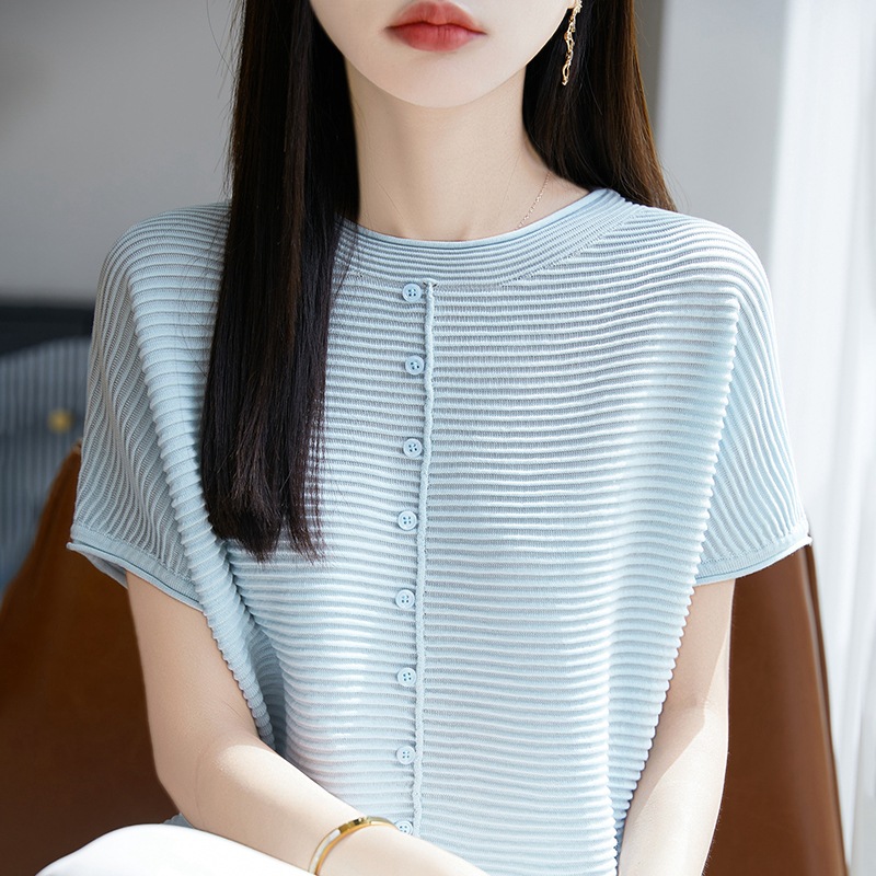 2025年新型洋気減齢レジャー天糸坑ボタン飛袖上着女性薄手ニット半袖tシャツ
