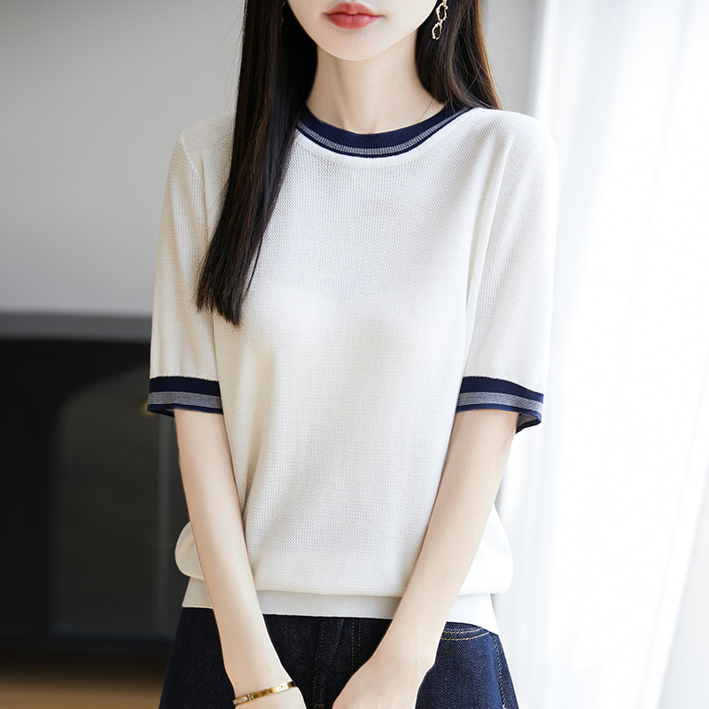 2025 新しい夏のシルク薄いポロネックセーター半袖女性のルーズ痩身カラーブロックボトリングトップ