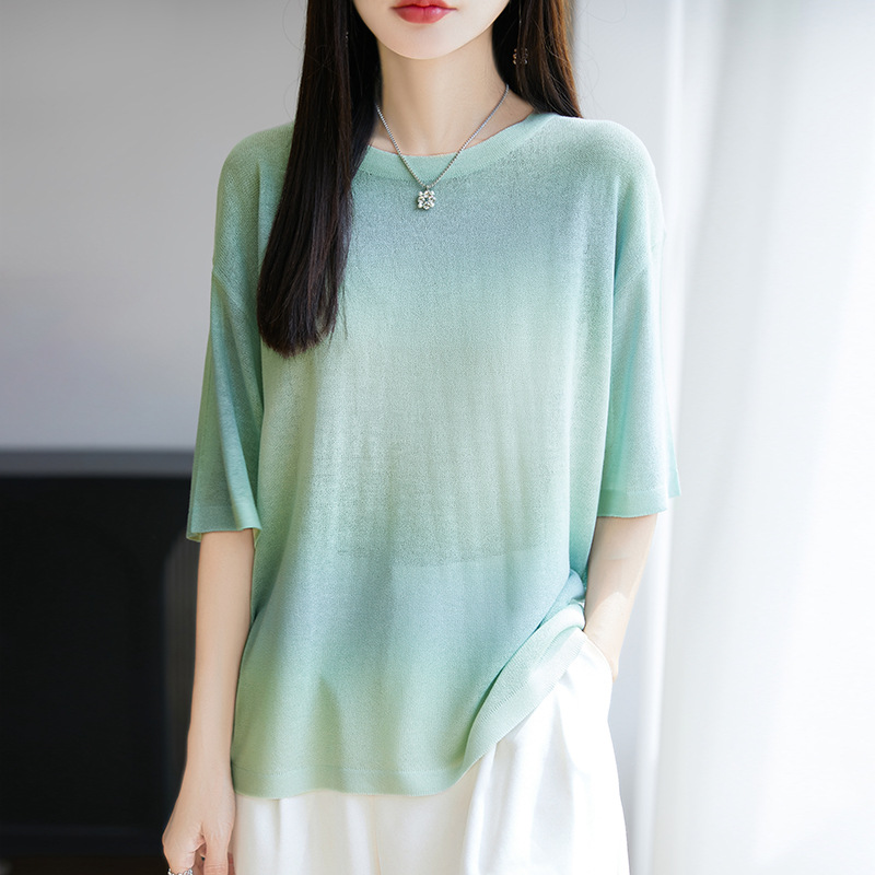 2025年夏の新型丸襟ニット半袖tシャツ女性の薄いタイプの天糸の底のシャツのゆったりした半袖の上着のファッション