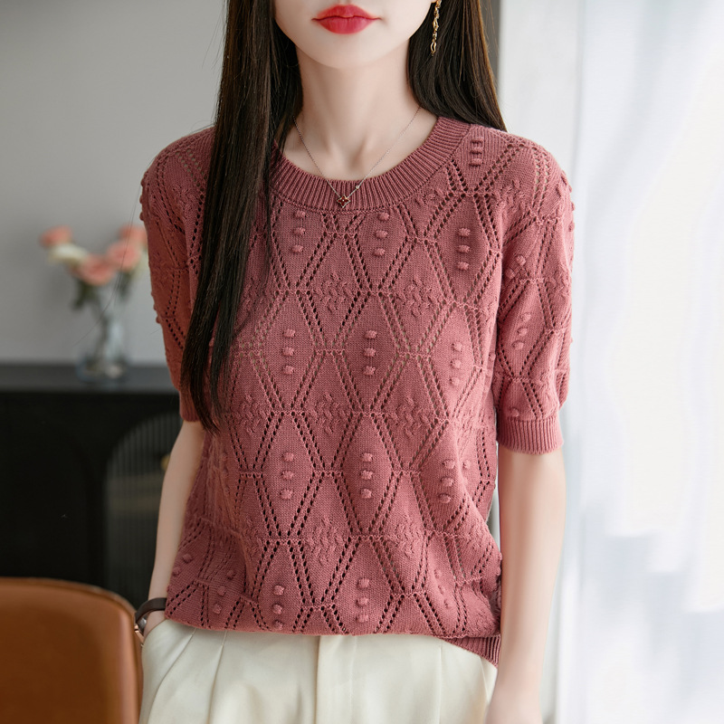 純綿のフランス式の透かし彫りのtシャツのニットの女性の夏のタイプのファッションの洋風はゆったりしていて、痩せています。