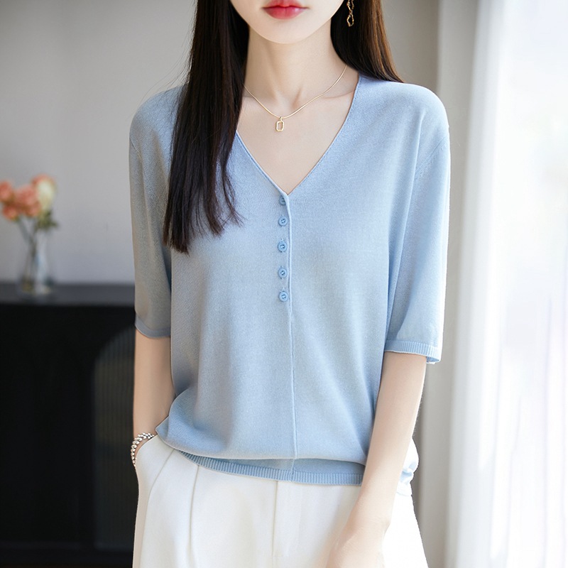 2025 新しい夏の女性のアイスシルク半袖 Tシャツ V ネックプルオーバー半袖ニットシャツルーズトップ