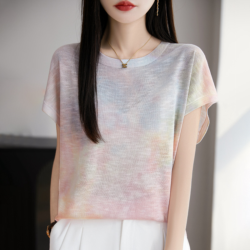 25 新しい夏のニット半袖プルオーバーラウンドネックカラフルな絞り染め小さなフライングスリーブトップ女性のための多用途クールプリント t