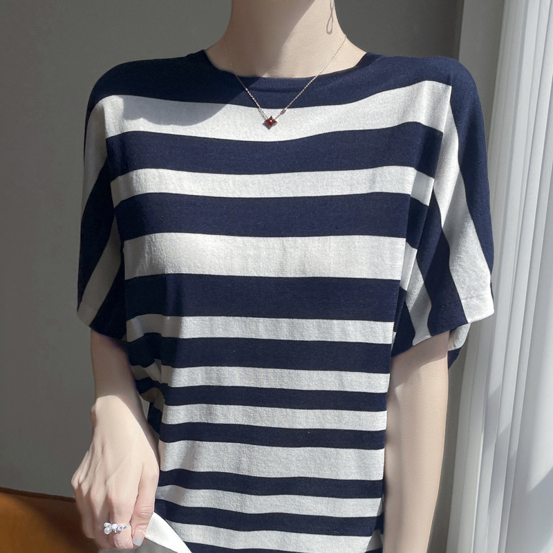 25年春夏新作シルク天糸綿丸首ニット半袖tシャツ女性色合わせストライプシャツ上着
