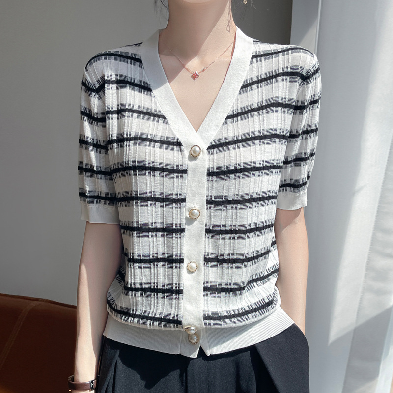 Xiaoxiangfeng V ネックニットカーディガン女性のための春と夏の新しいルーズコントラストストライプ半袖ファッション通勤ジャケットトップ