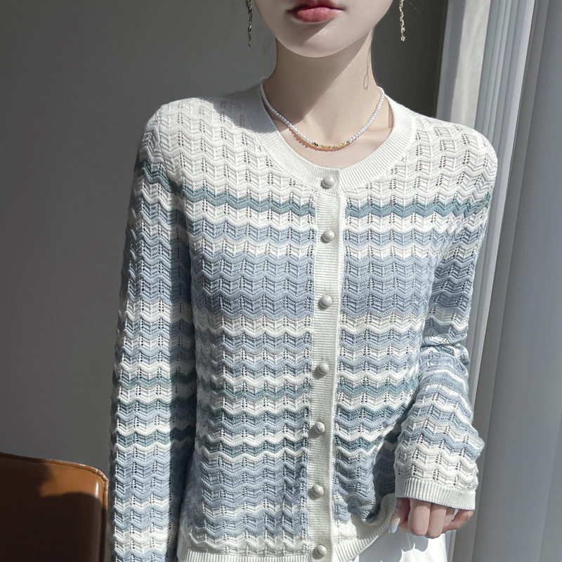 2025 春夏新作梳毛ウールラウンドネックニットカーディガン中空カラーブロックストライプルーズで多用途な女性用トップス
