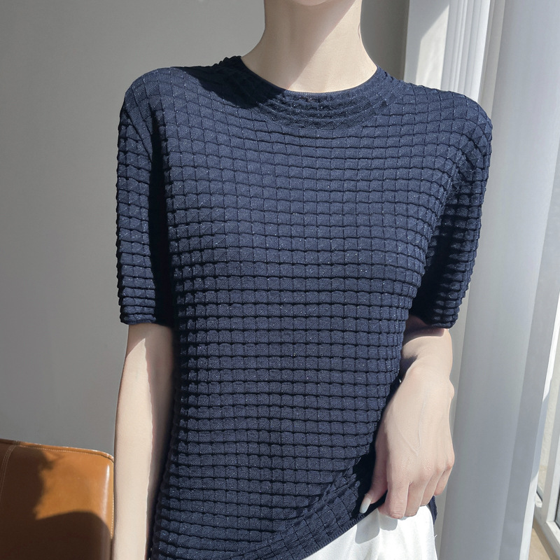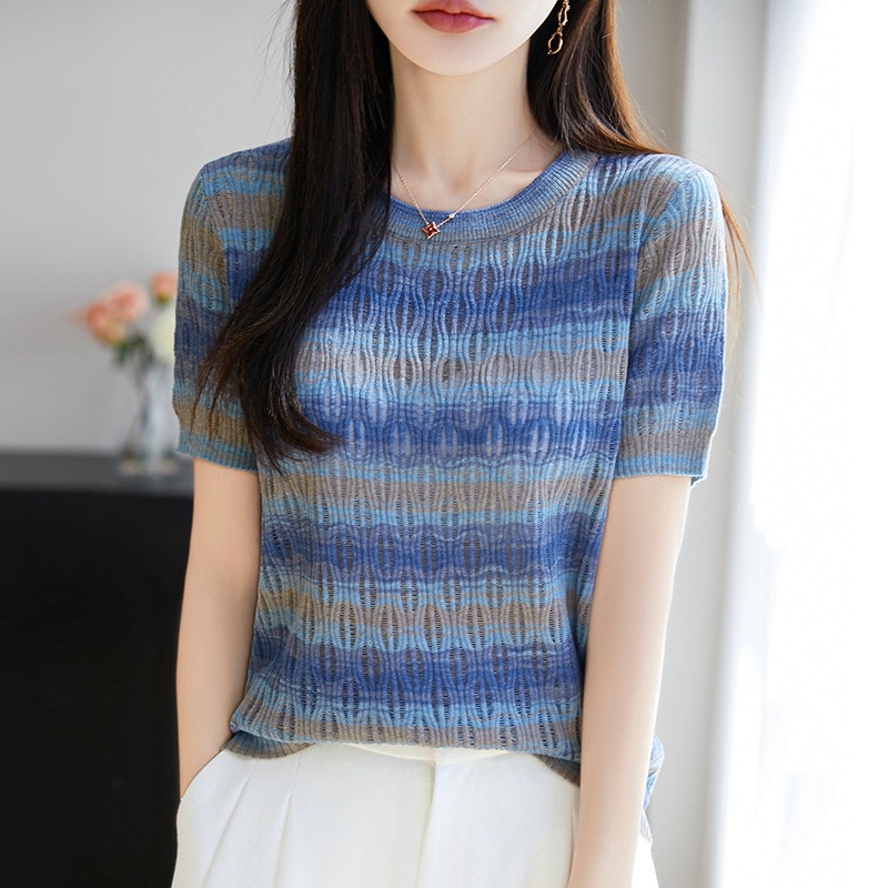 2025年夏の新型绢糸天糸丸首ニット半袖tシャツ女性透かし彫り鉤花プルオーバー