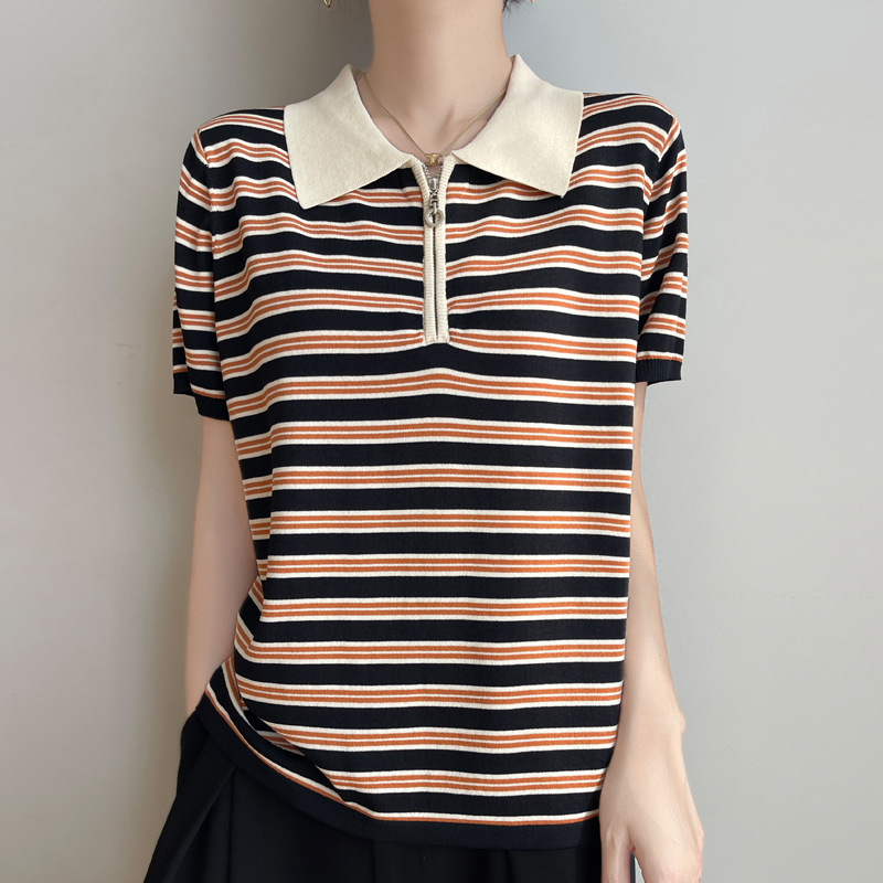 2025 春夏新スタイルビーズラペルハーフジップセーター半袖女性のカラーブロックストライプルーズボトムシャツ