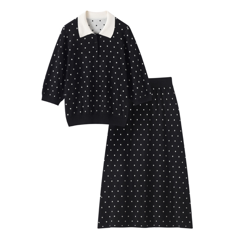 ガーゼウーブンレディースラペルトップとウエストゴムスカート、優しい風ニット9分袖スカートスーツ