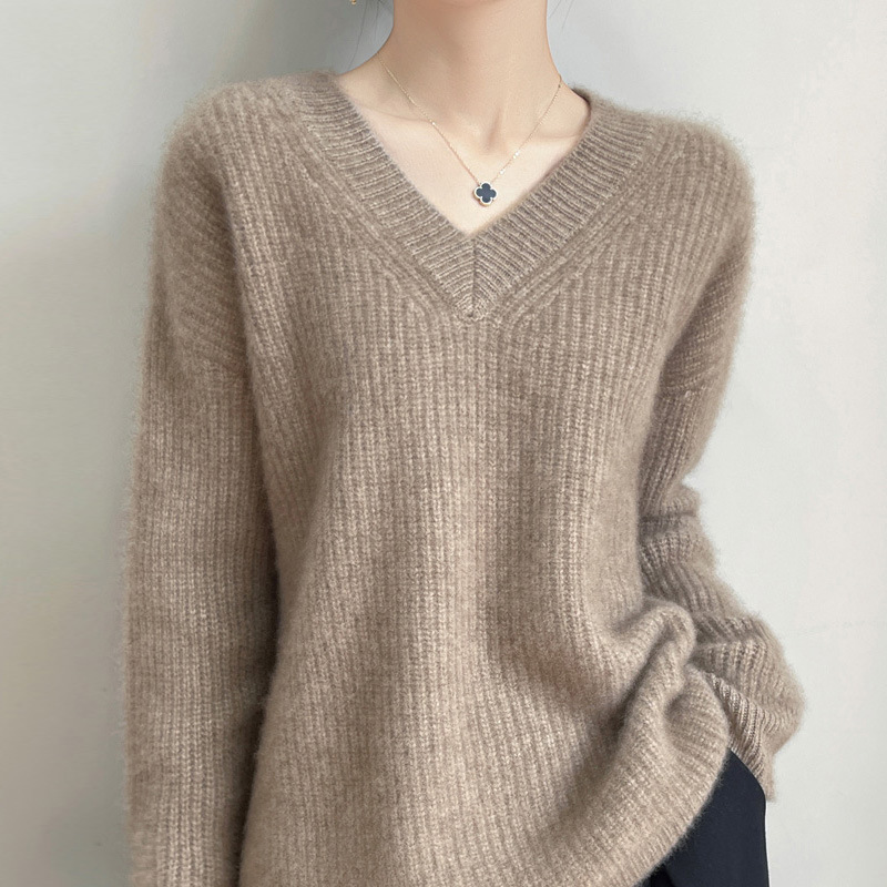 怠惰なvネックプルオーバーセーターの女性がゆるい2024秋冬の新しいデザイン感ウールニットの外着