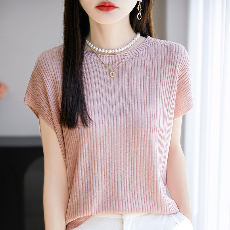 25年夏の新作ラウンドネックテンセルニット半袖Tシャツレディース薄手ファッショナブルな気質痩身アイスシルクトップ卸売