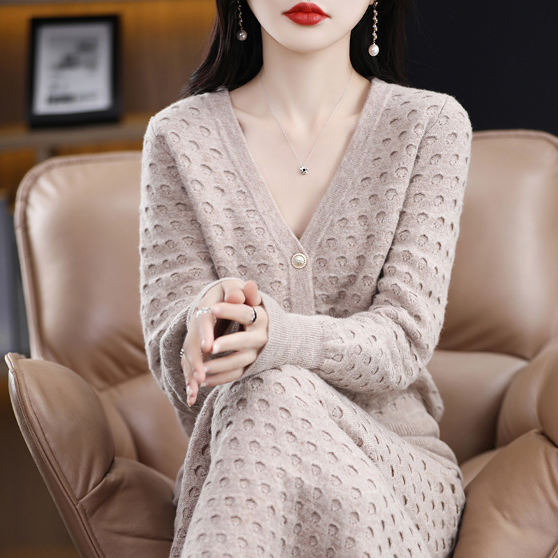 23年の春の新型女性セーターのスカートのスーツは家の外で純色のウールのニットの保温vネックの単列ボタンを着ます。