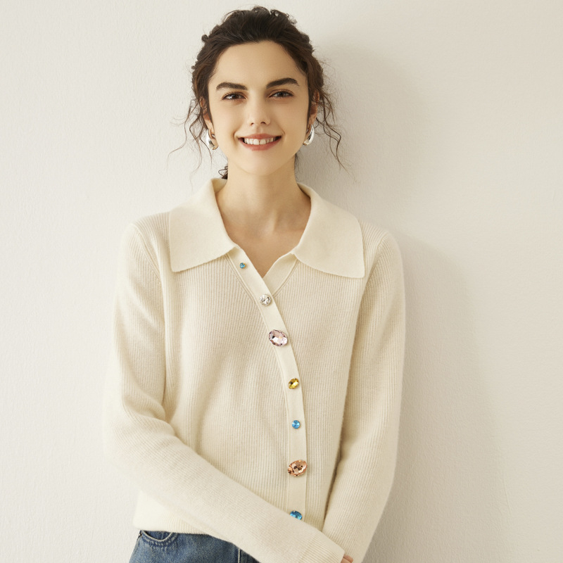 カシミヤ2024秋冬の新しい女性の短いシャツの襟の純色のカラーボタンのプルオーバー