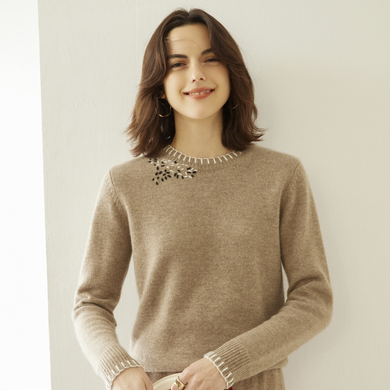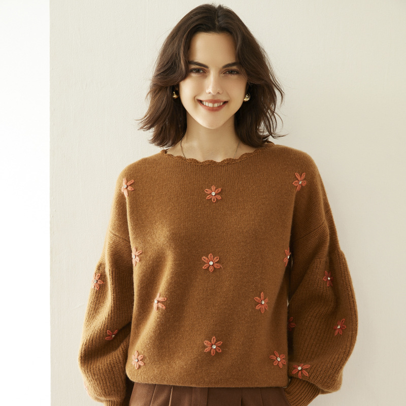 24秋冬の新型カシミヤの女性の丸首の頭の純色の花びらの刺繍の長袖のゆったりしている保温のウールの底のシャツの女性