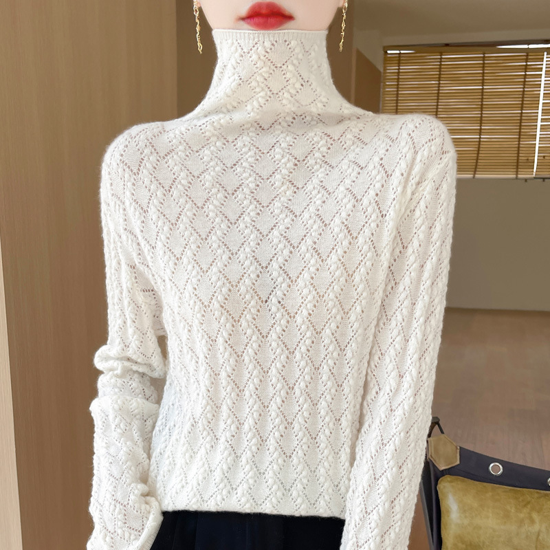 24年秋冬新作純ウールの山の襟のニットの長袖の女性の透かし彫りのフックのデザイン感の底のシャツの上着