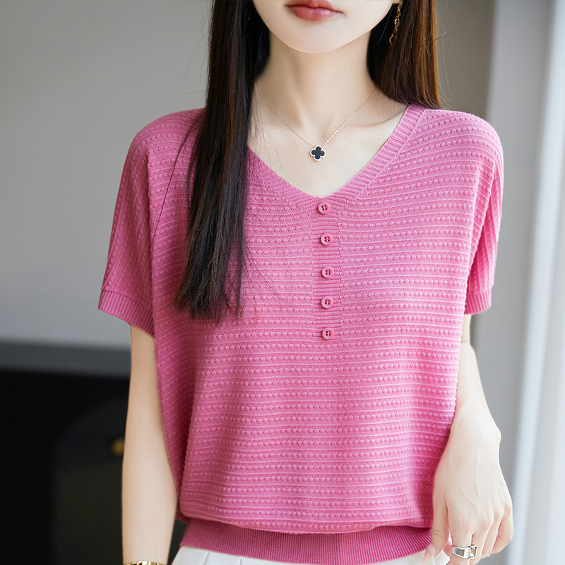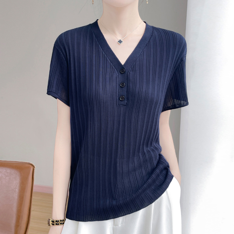 新しいテンセルリヨセルVネック無地ニットTシャツ半袖多用途薄手の質感夏スタイル
