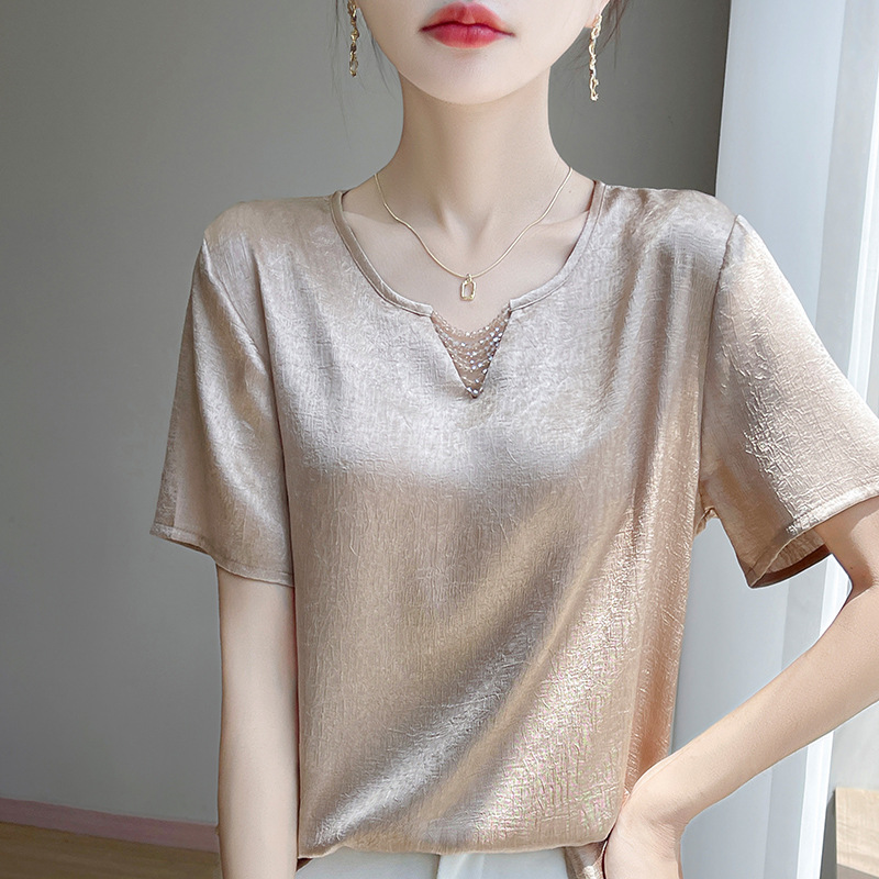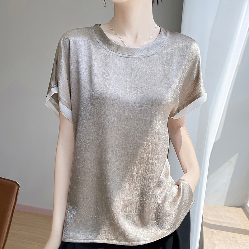 シルクサテン 25 新しい夏の女性のプリーツテクスチャラウンドネック半袖ファッショナブルな薄いベースレイヤー年齢を減らし、スリムにします