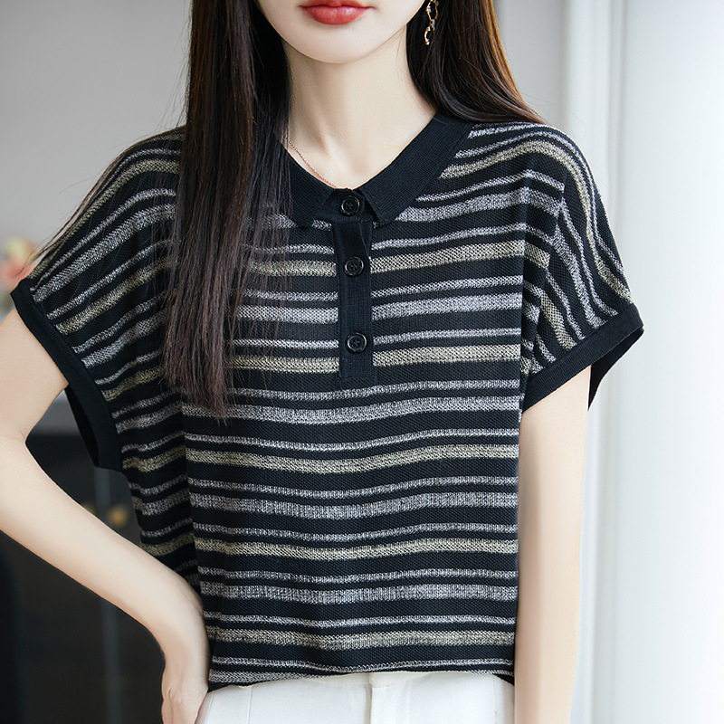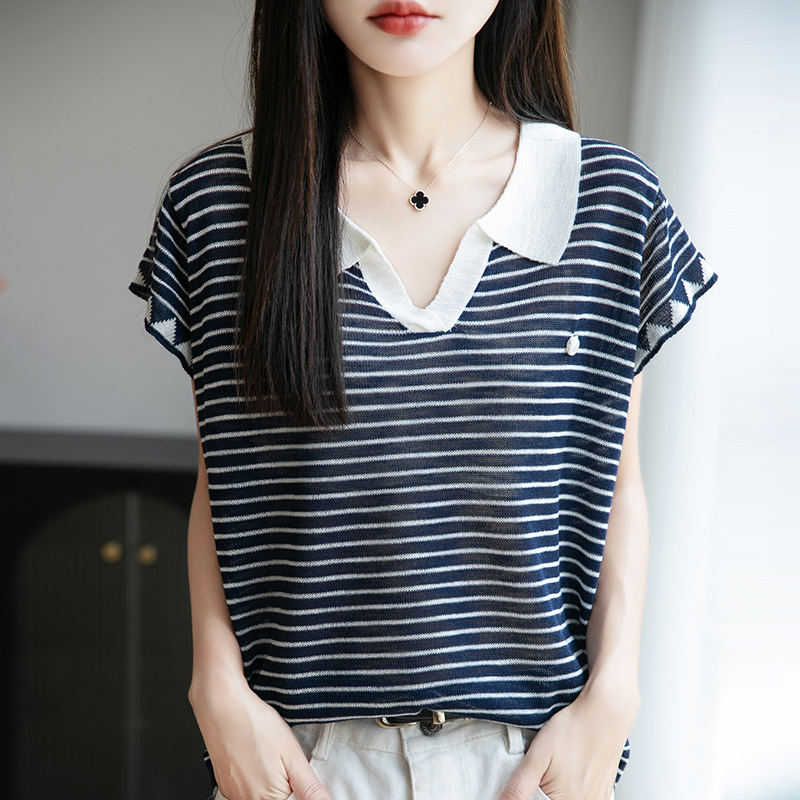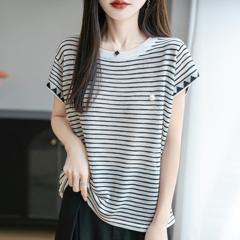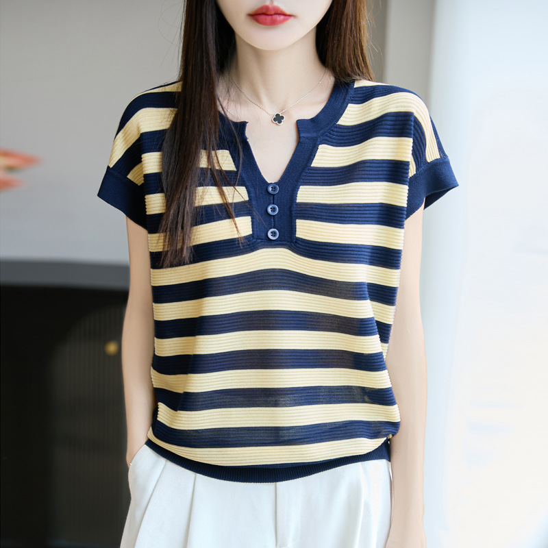 ストライプニットVネック半袖夏新作万能リヨセルテンセル小飛袖シンプル万能薄手トップス
