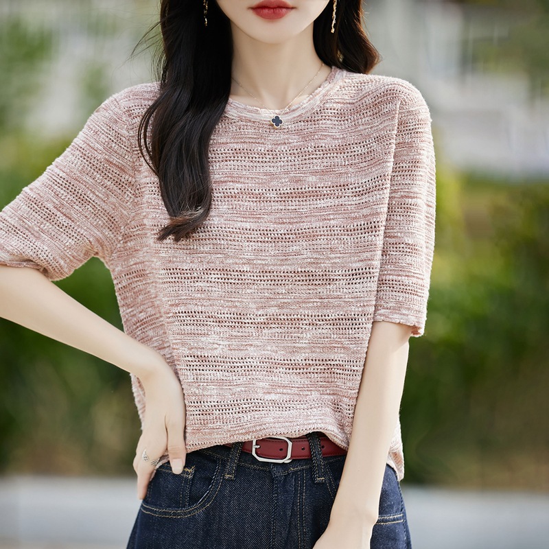 テンセル薄手半袖 Tシャツ女性の夏のカラーブロックラウンドネックジャカードファッションアイスシルクニットウェア