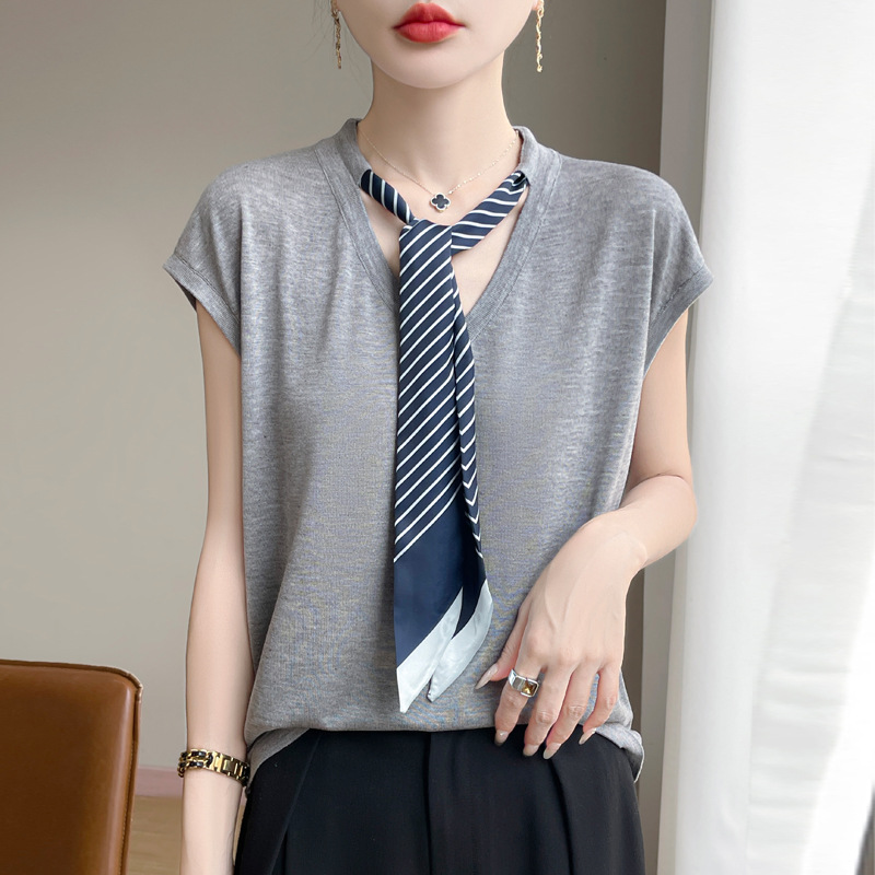 2025 夏の新テンセルリヨセルシルクスカーフ V ネックセーター半袖 Tシャツ女性のデザインファッショントップ