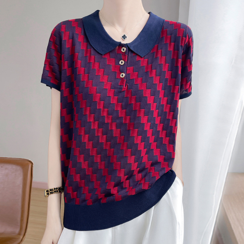 ベビードールカラー半袖Tシャツレディース夏新作年齢軽減ボトムス半袖コントラストカラー外国風レディーステンセルニットトップス
