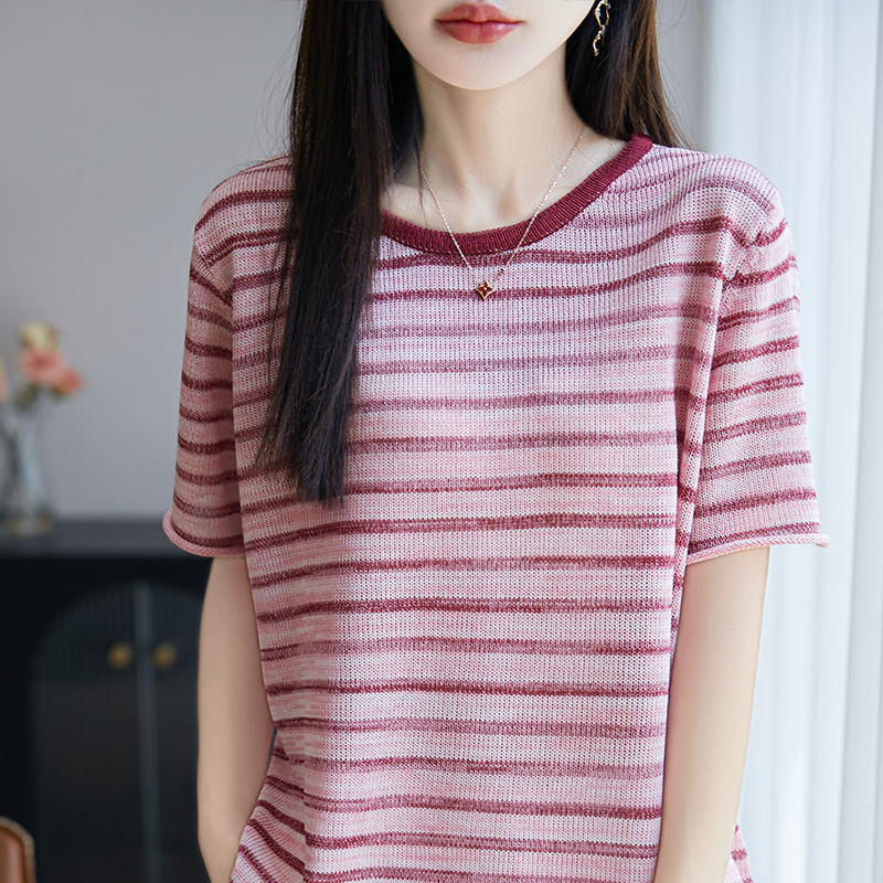 ピンクストライプラウンドネックアイスシルクニット半袖Tシャツレディーステンセルコントラストカラールーズで多用途な女性用薄手半袖トップ