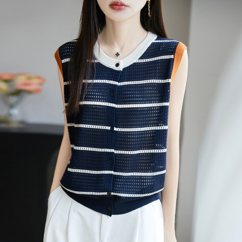 黒と白のストライプデザインのレトロな香港スタイルのベスト夏の香りの夏のレイヤードベストテンセルニットカーディガン