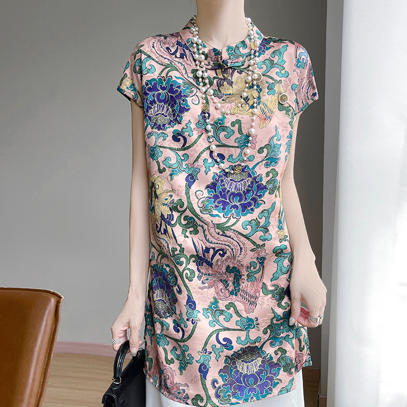 新しい中国風のレトロなスタンドカラー中国風半袖レディース夏 2025 新しいサテンプリントチャイナドレスミドル丈トップ