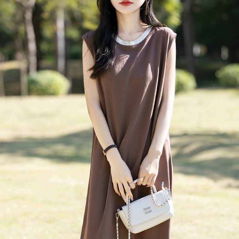 カラーブロックリネンニットドレスレディースルーズ薄型フェイクツーピース膝上ロングスカートラウンドネックノースリーブベストボトリングスカート